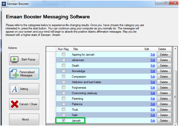 By selecting the option in Run Flag, this will allow the messages stored within “Love of Allah” to display on your screen. By clicking edit which is highlighted in blue this will show the categories within the title of “Love Allah”. |